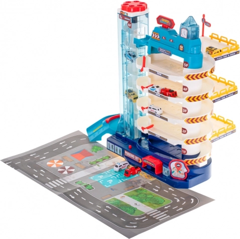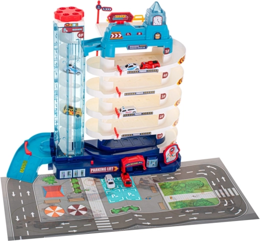 Didelė daugiaaukštė vaikų stovėjimo aikštelė siūlo net 5 parkavimo aukštus, elektrinį ir rankinį liftą, šviesos ir garso efektus bei papildomai 8 metalinius/plastikinius automobiliukus ir miesto žaidimų kilimėlį. Puikus žaislas vaizduotei, smulkiajai motorikai ir loginiam mąstymui lavinti.