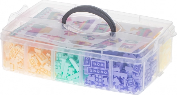 Skaidri dėžė su pertvaromis leidžia lengvai laikyti ir rūšiuoti kaladėles pagal spalvas.
