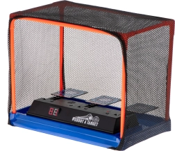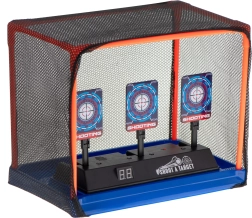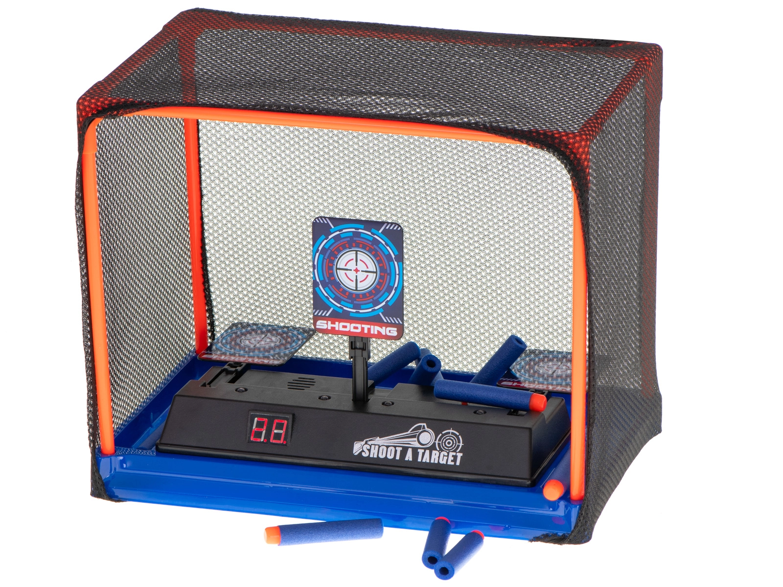 Pagerinkite taiklumą ir mėgaukitės valandomis pramogų su elektroniniu taikiniu su trimis taikeliais, automatiniu atstatymu, skaitmeniniu taškų skaičiuokliu ir šviesos bei garso efektais. Saugus tinklinis narvelis sulaiko putplasčio strėlytes ir palengvina tvarkymąsi.