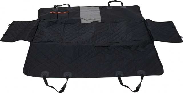 Didelis universalus automobilinis uždangalas dėžės formos greitai pritvirtinamas prie galvos atlošų su reguliuojamais dirželiais ir patikimai uždengia visą galinių sėdynių erdvę. Šonų užtrauktukai leidžia pakelti atvartus ir sukurti uždarą erdvę, todėl atidarius dureles šuo neiššoks. Atspari vandeniui ir lengvai valoma danga palaiko salono švarą net po išvykų lietuje ar miške.
