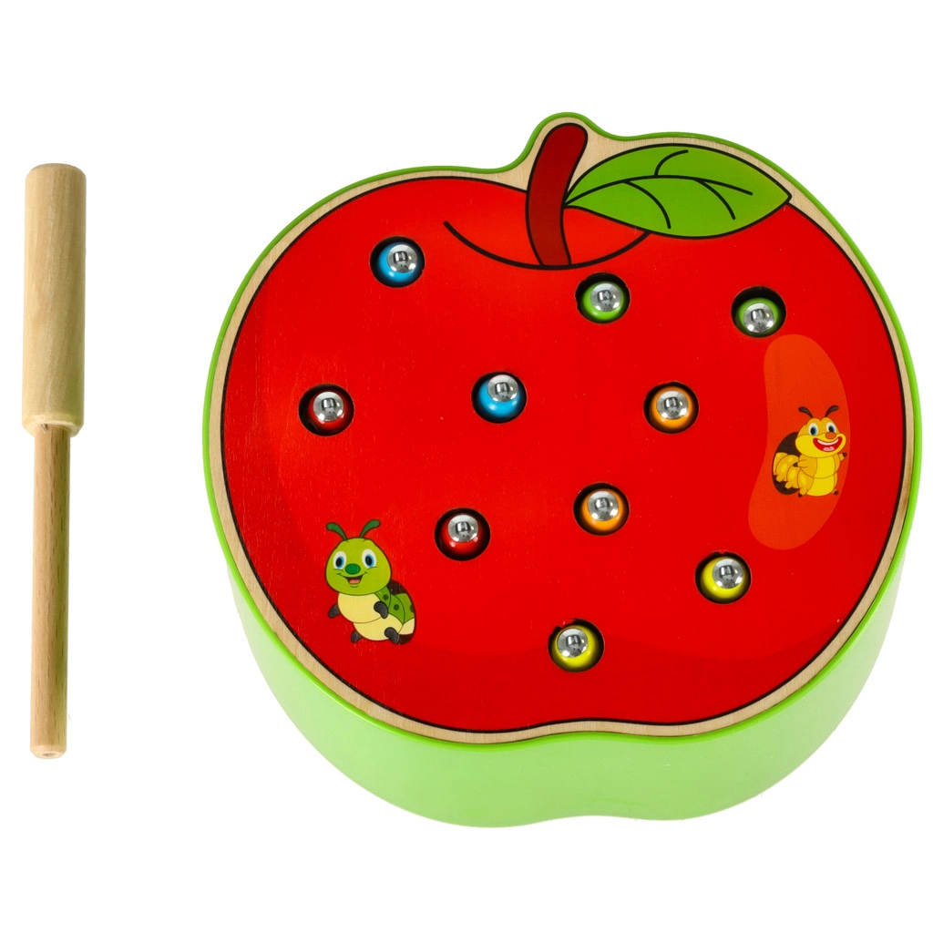 Magnetinė lazdelė ir angos obuolyje skatina vaikus atlikti tikslius judesius, taip natūraliai stiprinant rankų–akių koordinaciją ir kantrybę.