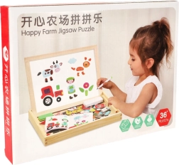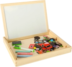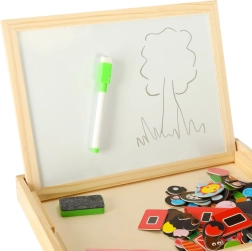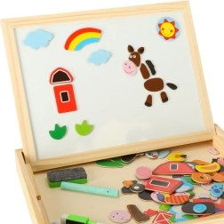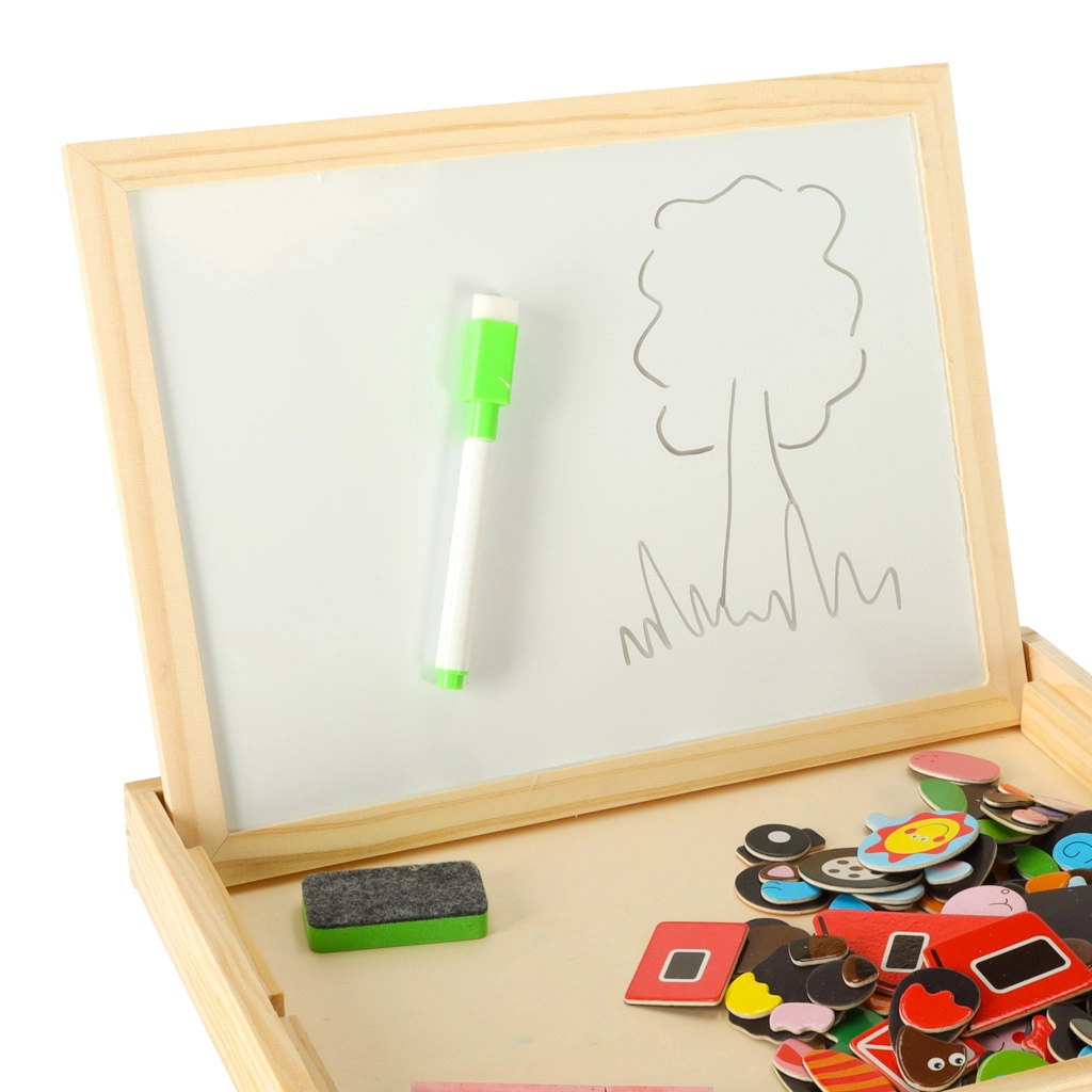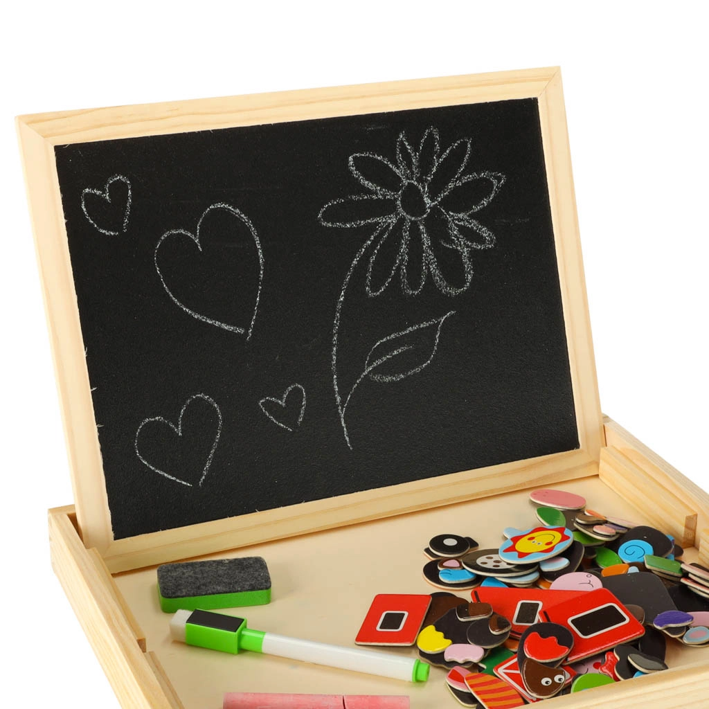 Dvipusė medinė lenta su magnetinėmis dėlionėmis idealiai tinka vaikų kūrybinei veiklai. Lenta pagaminta iš kokybiškos natūralios medienos ir apima įvairius elementus, kurie skatina mokymąsi ir žaidimą.
