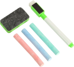 Rinkinys apima viską, ko reikia pradėti: dvipusę lentą, apie 100 magnetų, spalvotas kreidas, kempinėlę, žymeklius su veltiniu ir naudojimo instrukcijas.