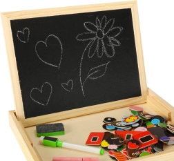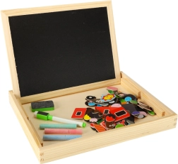 Siūlo baltą magnetinę pusę dėlionėms ir rašymui žymekliu bei juodą kreidinę pusę tradiciniam piešimui kreida.