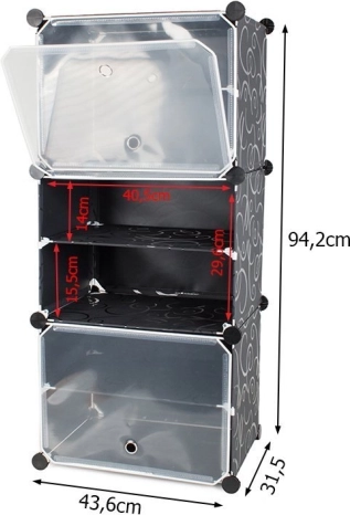 Su šia moduline lentyna jūsų batai ir aksesuarai visada bus tvarkingai sudėti. Spinta sudaryta iš trijų segmentų, ji lengva ir kartu stabili. Modulinė konstrukcija leidžia lengvai surinkti ir lanksčiai išdėstyti pagal jūsų poreikius. Metaliniai rėmai paprastai sujungiami naudojant ABS jungiamąsias detales.