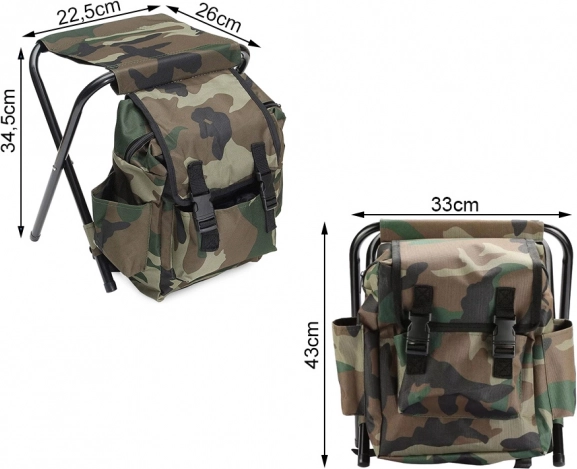 Praktiška sulankstoma kėdė su integruota kuprine idealiai tinka žvejybai, stovyklavimui, paplūdimiui ir sodui. Siūlo patogią ir stabilią sėdimą vietą, tvirtą plieninį rėmą ir erdvų krepšį po sėdyne su kišenėmis gėrimams ir smulkmenoms. Sulanksčius užima minimaliai vietos, o dėl diržų patogiai nešiojama ant nugaros.