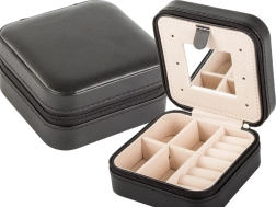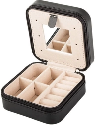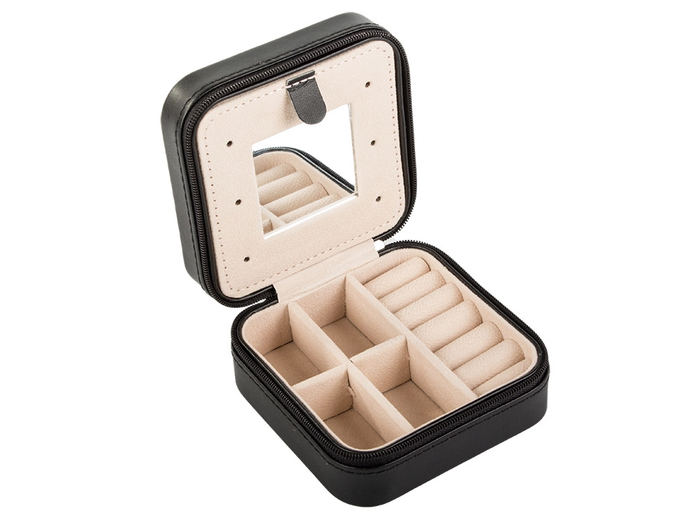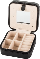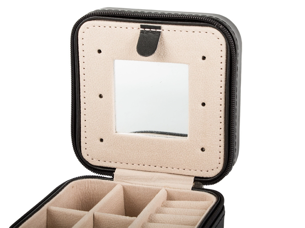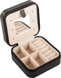 10 × 10 × 5 cm papuošalų dėžutė telpa į bet kurią rankinę ir kartu, dėl sumanaus išdėstymo, sutalpina žiedus, auskarus ir grandinėles.