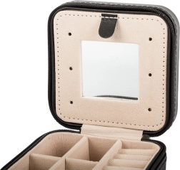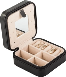 Elegantiška kelioninė papuošalų dėžutė su kompaktiškais matmenimis puikiai apsaugo ir sutvarko jūsų papuošalus namuose ir kelionėse. Siūlo daugiau skyrelių, paminkštintą vietą žiedams, kabliukus grandinėlėms ir praktišką veidrodėlį. Dėl užtrauktuko užsegimo jūsų aksesuarai yra saugūs, o minkštas aksominis vidus saugo nuo įbrėžimų.