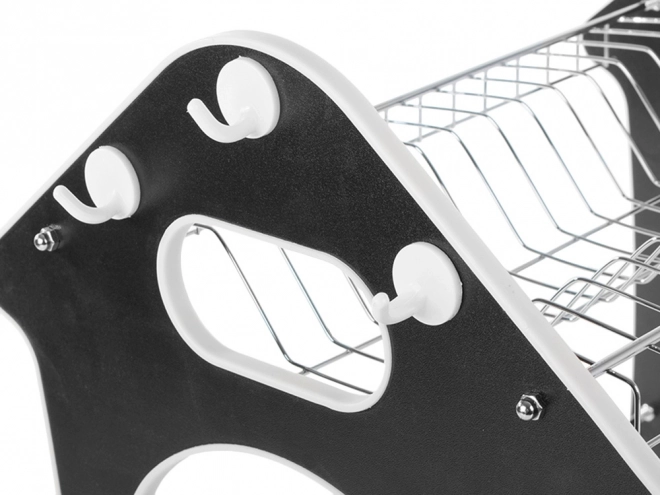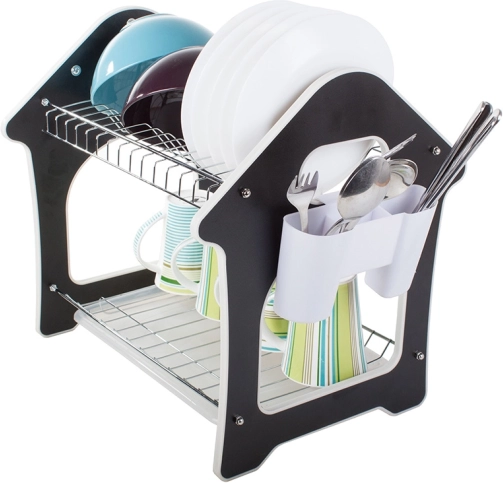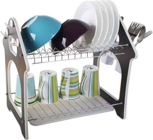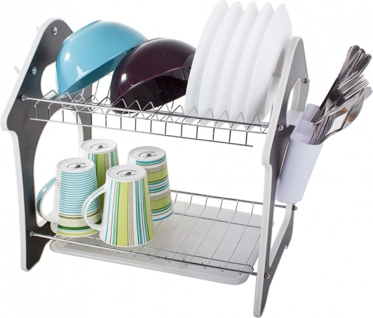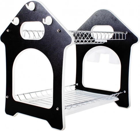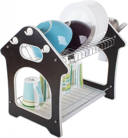 Praktiškas dviaukštis indų džiovintuvas su vandenį surinkančiu padėklu, stalo įrankių laikikliu ir trimis kabliukais virtuvės priedams. Siūlo didelę talpą, patvarią metalinio ir plastikinio korpuso konstrukciją bei stabilią bazę, kuri apsaugo stalviršį nuo drėgmės. Stilingas namelio formos dizainas puikiai tiks bet kuriai virtuvei.