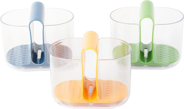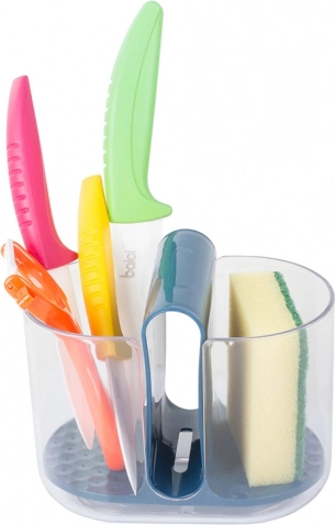 Šoniniai skyriai skirti stalo įrankiams, o vidurinis skyrius puikiai tinka indų plovimo kempinėlei ar šepetėliui. Integruotos angos leidžia vandeniui nuo įrankių nubėgti į apačią, taip užtikrinant greitą džiūvimą. Lašėtuvas lengvai išimamas, todėl patogu jį ištuštinti ir prižiūrėti.