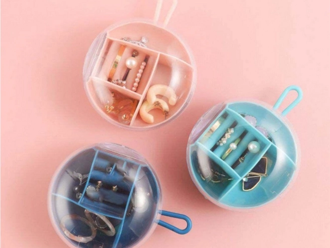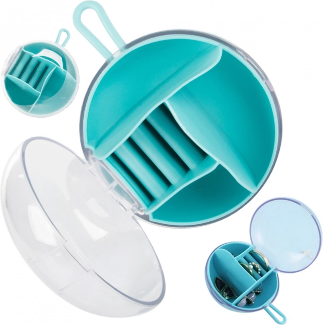 Ši elegantiška kelioninė papuošalų dėžutė padės išlaikyti jūsų vertybes saugiai ir tvarkingai. Apvalus, iš tvirto plastiko pagamintas dėklas turi įvairių tipų ir dydžių skyrelius, įskaitant žiedų laikiklius, todėl kiekvienas dirbinys turi savo vietą. Permatomas dangtelis leidžia greitai apžiūrėti turinį neatidarius, o guminė kilpa užtikrina patogų nešiojimą.