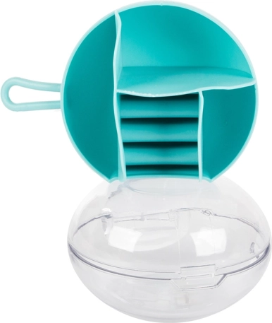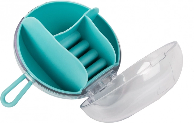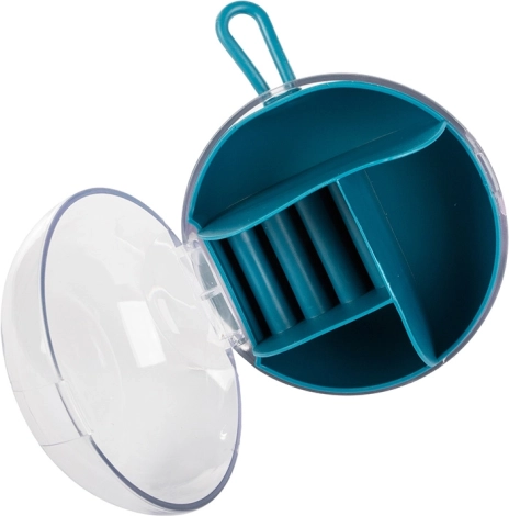 Dėl išimamo centrinio organizatoriaus dalį skyrelių galima naudoti ir atskirai. Kompaktiški matmenys – skersmuo 9 cm ir aukštis 6 cm – daro jį idealiu pasirinkimu rankinei, lagaminui ar tualetiniam staliukui. Galimos spalvos: rožinė, tamsiai mėlyna, žalia.