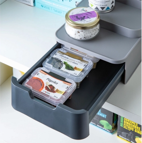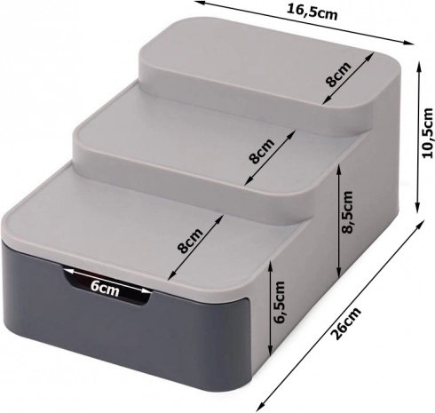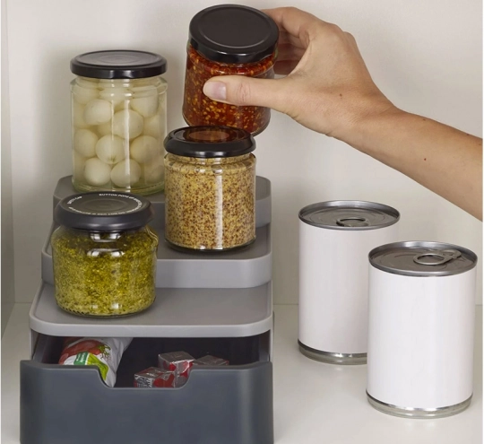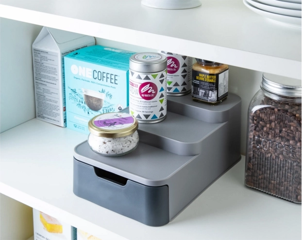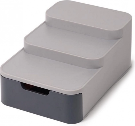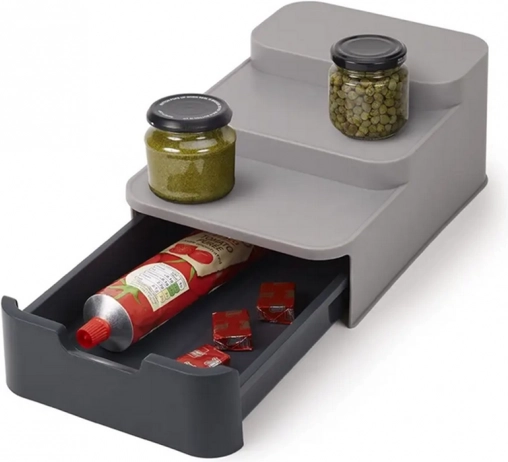 Šis kompaktiškas organizatorius efektyviai išnaudoja vietą jūsų sandėliuke ar spintelėje. Trys pakopos užtikrina geresnį matomumą stiklainiams ir skardinėms galinėje eilėje, o ištraukiamas stalčius talpina maišelius, tūbeles ir kitas smulkmenas. Patvarus pilkos spalvos plastikas lengvai valomas ir puikiai dera modernioje virtuvėje.