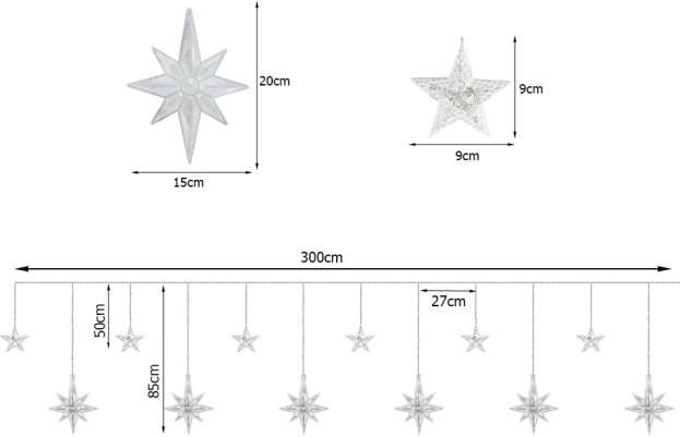 Užuolaidoje yra 6 didelės žvaigždės ir 6 mažesnės žvaigždės, o bendras ilgis – 5 m. Iš 8 skirtingų šviesos programų galite pasirinkti norimą atmosferą, naudodami pridedamą nuotolinį valdymą.