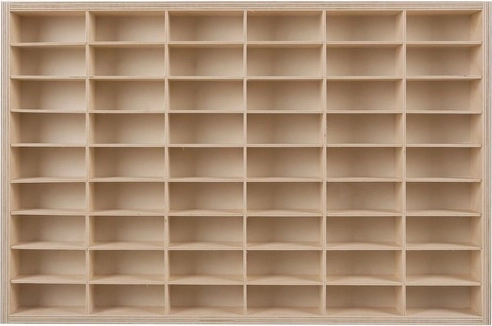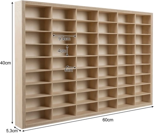Išmanioji išimamų skirtukų iš 3 mm faneros sistema leidžia keisti išdėstymą pagal poreikį – sukurkite mažesnius ar didesnius skyrelius tiksliai jūsų kolekcijoms. Lentyna paruošta montavimui ant sienos, tačiau ją galima ir pastatyti ant komodos ar stalo. Pakuotėje rasite montavimo rinkinį ir 2 kabliukus saugiam tvirtinimui.