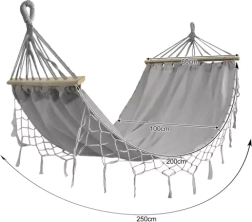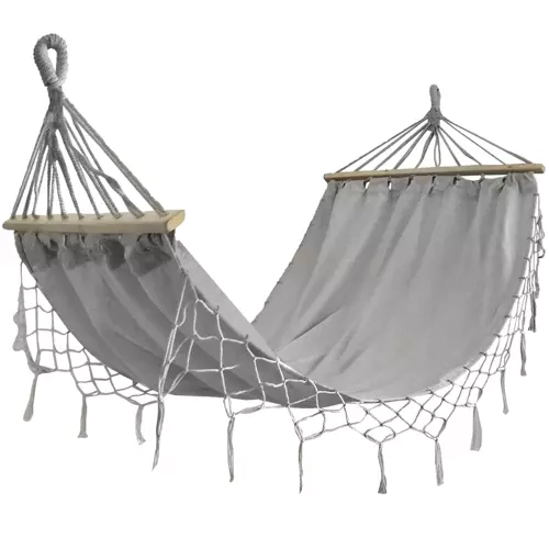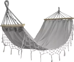 GARDLOV hamakas dera natūralią išvaizdą su dideliu patvarumu. Maloni medvilnė su poliesterio priemaiša yra švelni liečiant, gerai kvėpuoja ir puikiai tinka kasdieniam naudojimui. Mediniai skersiniai (80 cm) palaiko išskleistą hamako plotą, todėl patogu tiek atsigulti, tiek prisėsti.